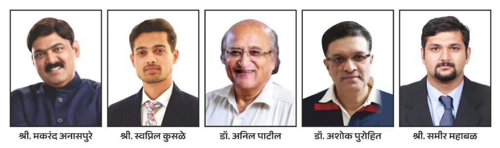पुरस्काराचे मानकरी: मकरंद अनासपुरे, स्वप्निल कुसळे, डॉ. अशोक पुरोहित, डॉ. अनिल पाटील, महाबल ग्रुप ऑफ इंडस्ट्रीज. कोल्हापूर: संजय घोडावत विद्यापीठाचे